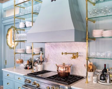 This coffee station feels closer to furniture than cabinetry. The arched opening softens the wall and turns the coffee area into a visual anchor. Marble surfaces and open shelves elevate the space, while lower cabinets handle storage. I see this working best in kitchens that lean classic or transitional.