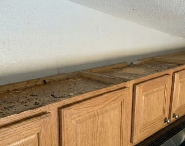 Using cabinet material to cover the wall behind the counter