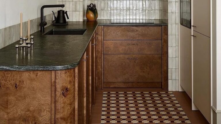 The mix of textures is what I keep noticing here. The darker countertop, the patterned floor, and the wood cabinetry all layer together without competing. It makes the kitchen feel richer without adding clutter.