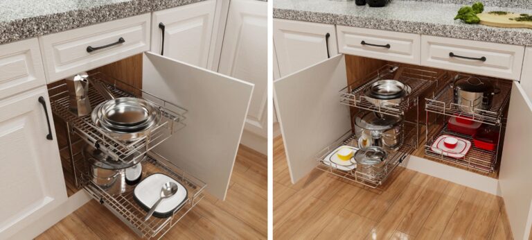 This corner organizer blends rotation with reach to make large corner cabinets fully usable. Instead of fixed shelves or blind pull-outs, the chrome baskets rotate a full 360 degrees while the center tiers slide forward, so items aren’t trapped at the back.