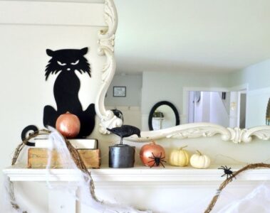 Once the ghosts are all hung on the twine, it’s ready to hang! This is such a cute and inexpensive bit of Halloween decor! Make sure to keep it out of reach of kids, pets and open flame.
