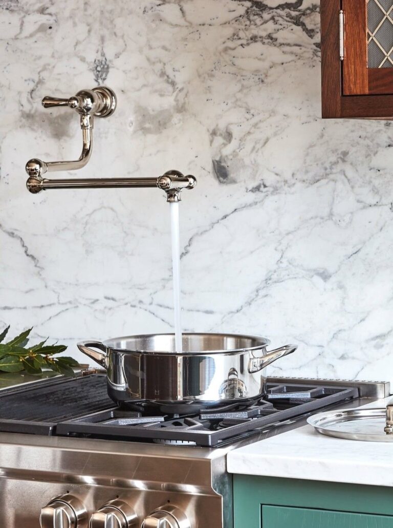 Here, the pot filler almost disappears until it’s needed — a subtle luxury.