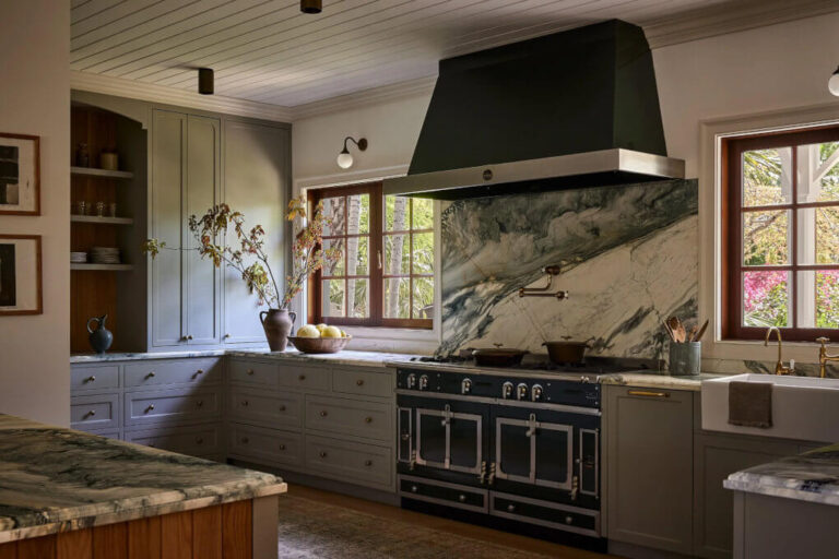 Designed for the 2025 Pasadena Showcase House, this kitchen is a lesson in atmospheric storytelling. The marble backsplash is the undisputed protagonist, featuring thick, rust-colored veins that stretch across the stone like branches in a winter forest, perfectly echoing the warm wood paneling above. It grounds the “soft palette” of creams and browns, connecting the checkerboard floor to the “olive-toned” cabinetry in a way that feels organic and inevitable.