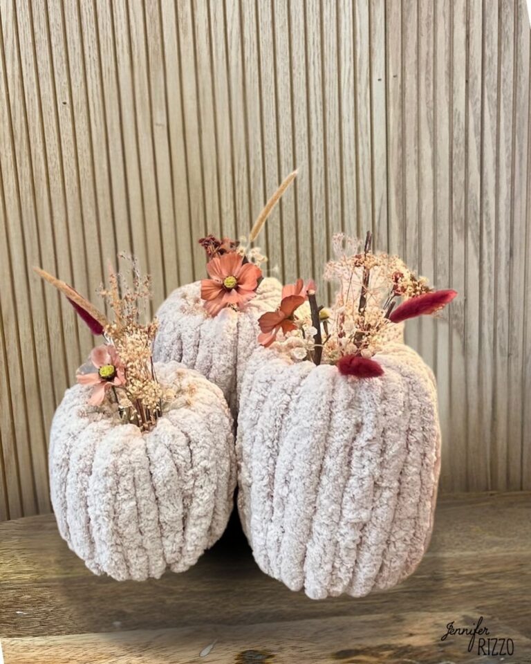 Three plush, textured fabric pumpkins decorated with dried flowers and foliage are displayed on a table. A person is partially visible in the background.